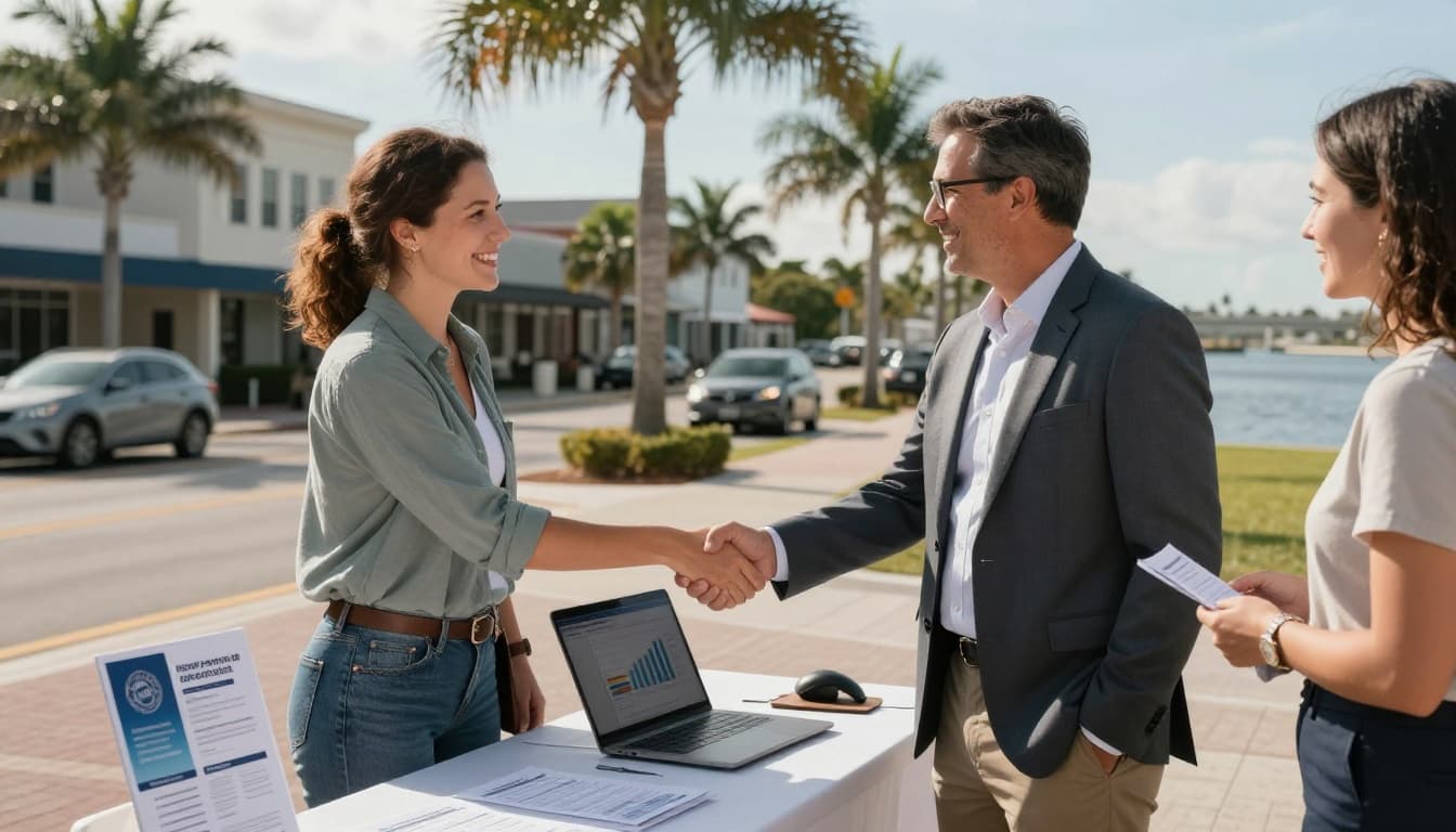 Two local leaders connecting at a Fort Myers community booth, created with AI.